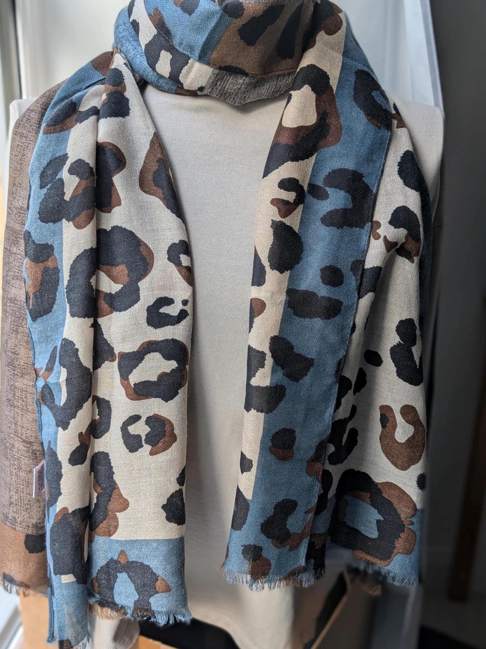 Leopard Print Scarf Cream, Blue + Dark Brown ,Winter Animal Print Scarf, Soft S