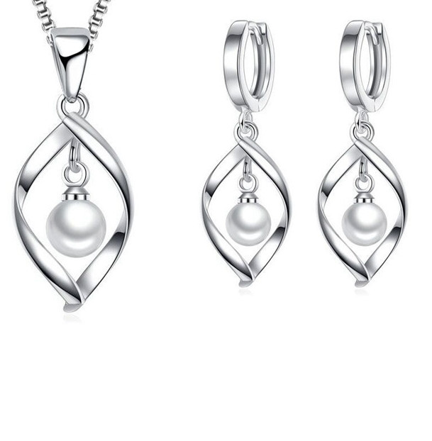 925 Heart Teardrop Pearl Sterling Silver Plated Pendant Necklace + Earrings Sets