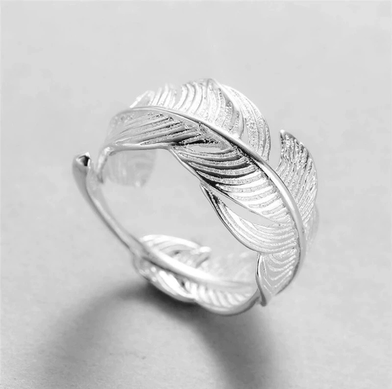 925 Leaf/Feather Shiny Ring Sterling Silver Plated Open Resizeable Finger Band
