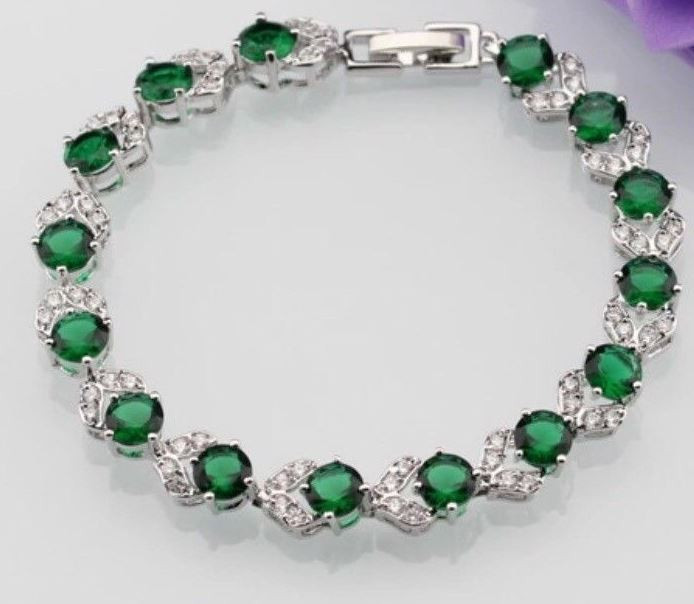 925 Sterling Silver Bracelet Emerald Green + White Topaz 18cm Adjustable + Gift