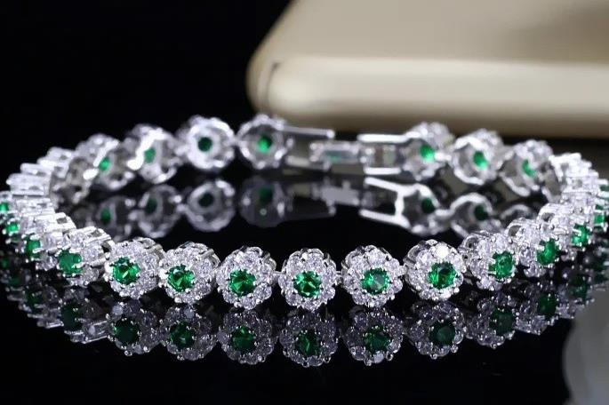 925 Sterling Silver Flower Tennis Bracelet Emerald Green Gemstone 17.5cm +2.5cm