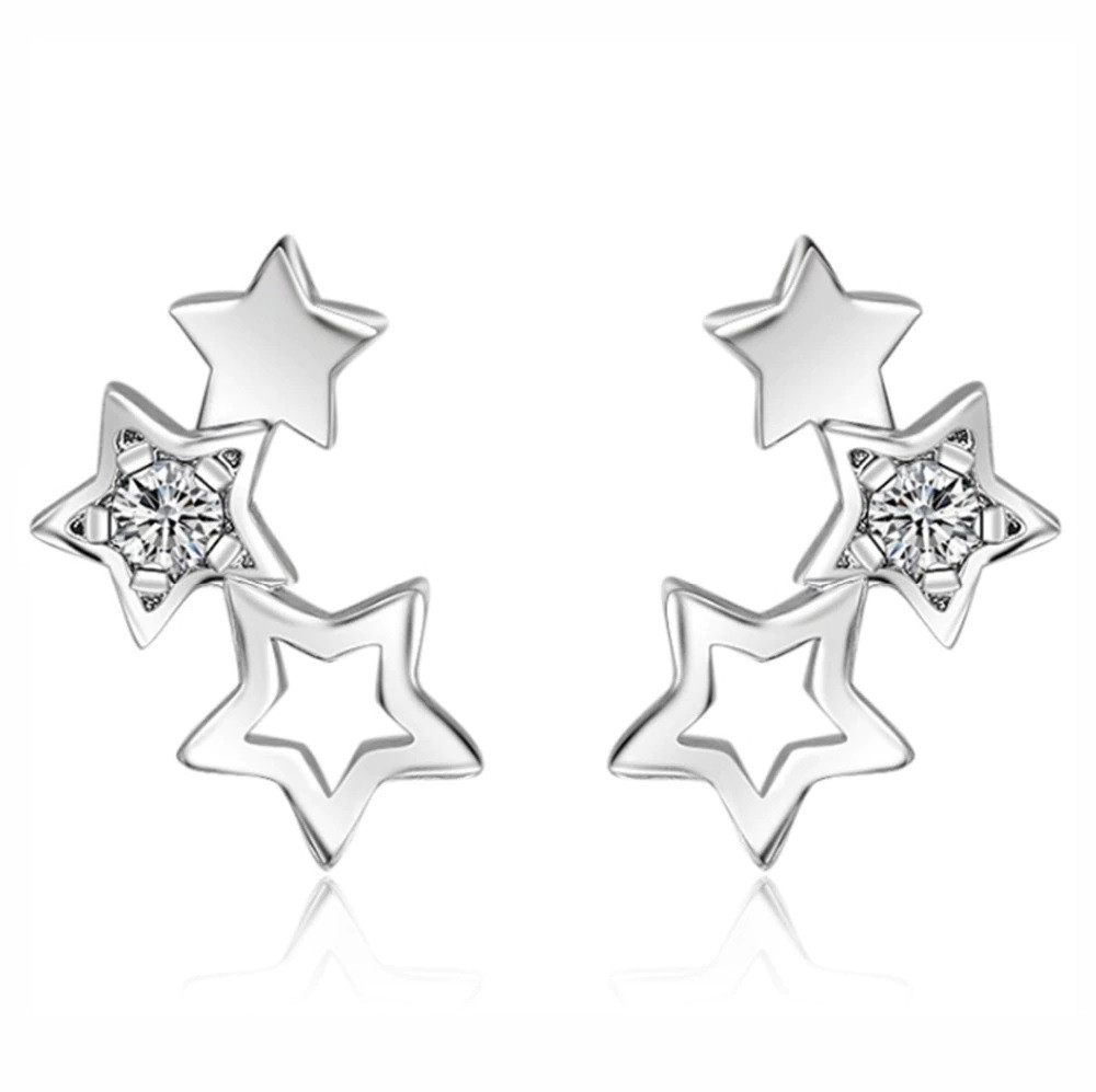 925 Sterling Silver Plated 3 Stars Crystal Stud Earrings + Bag