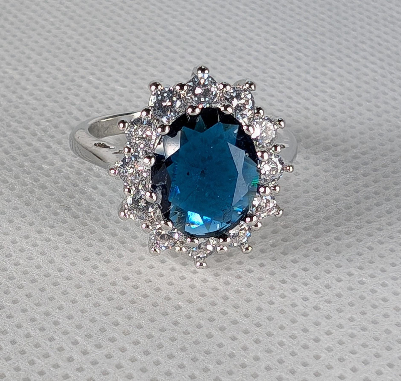 Blue Sapphire Crystal Silver Ring For Women, Adjustable Ring M-R, Open Band, Statement Ring