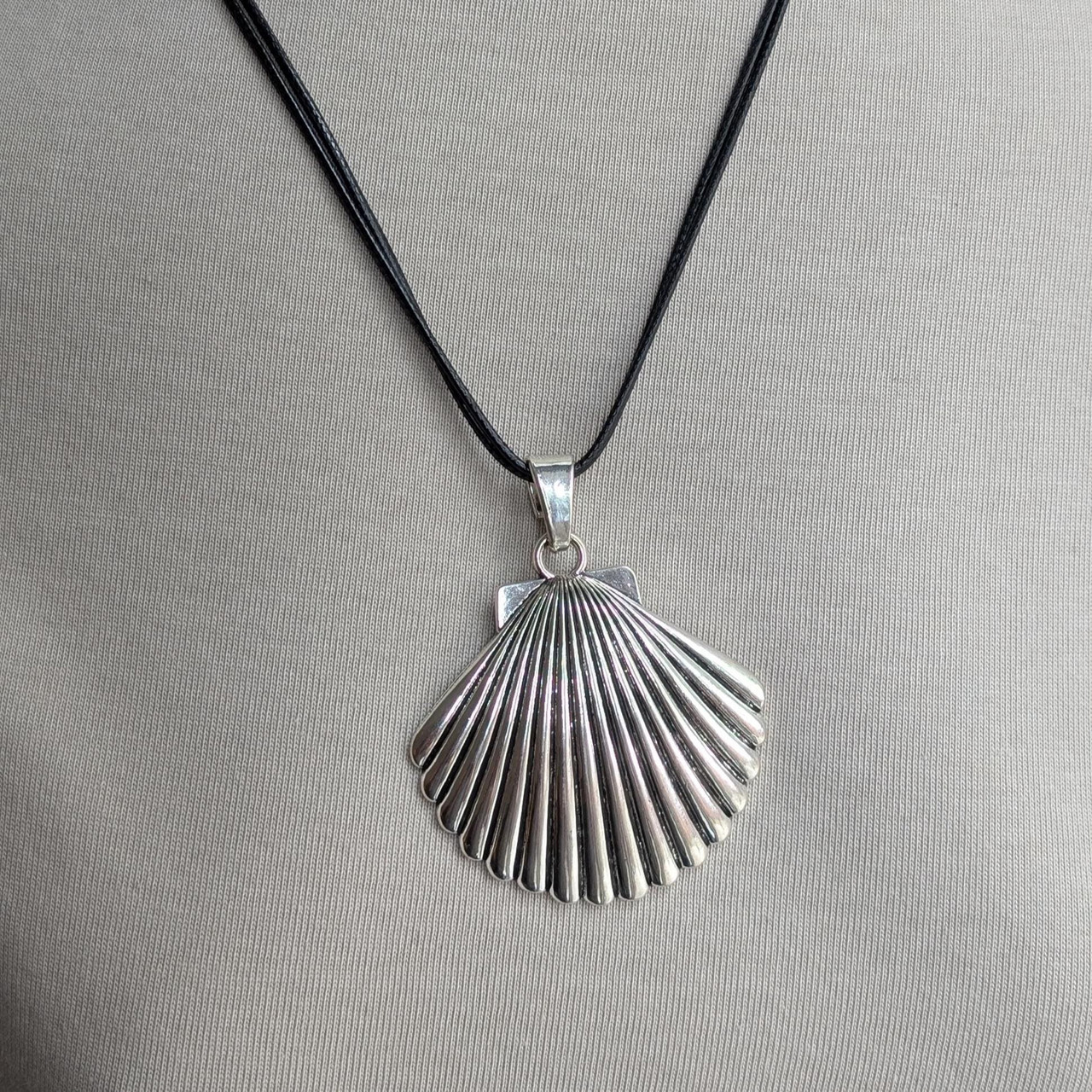 Chunky Silver Seashell Pendant Necklace + Bag, Choice Of Chains Black Cord 50cm,