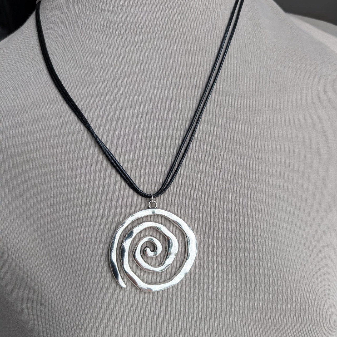 Chunky Silver Spiral Coil Pendant Necklace + Bag, Black Cord Chain 45-50cm Chunky Necklace, Spiral Coil Circles Pendant Necklace