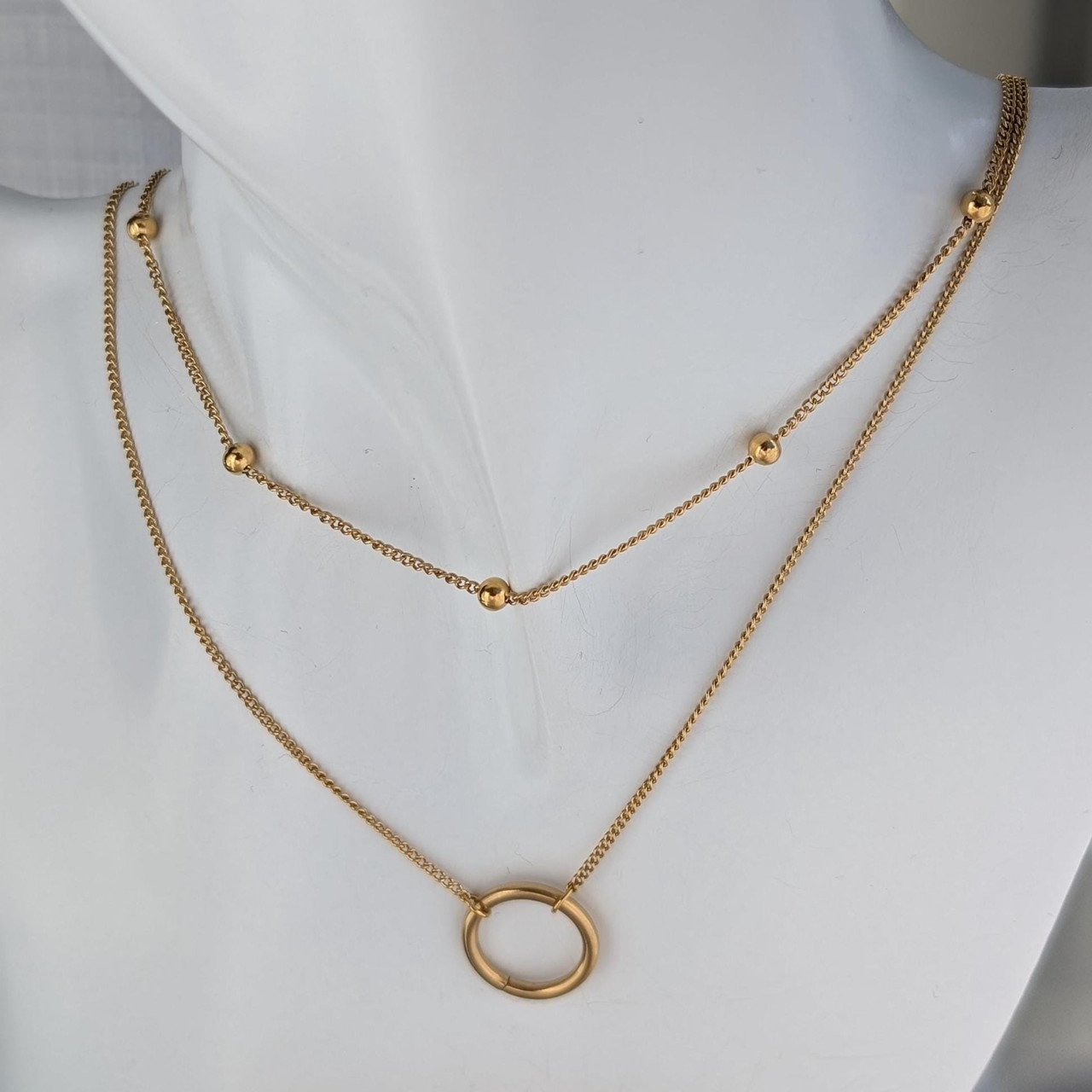 Layered Beads & Circle Gold Necklace, Double Link Pendant Chain Gold Plated
