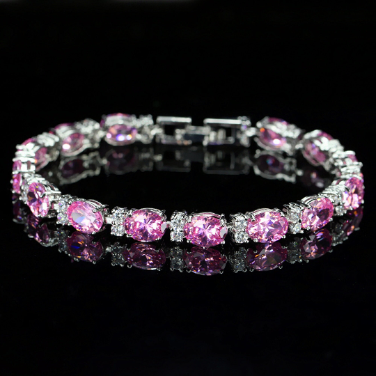 Pink Sapphire Silver Tennis Bracelet Oval White Topaz 17.5cm+ 2.5cmChain Length 17.5cm + 2.5ccm Extender