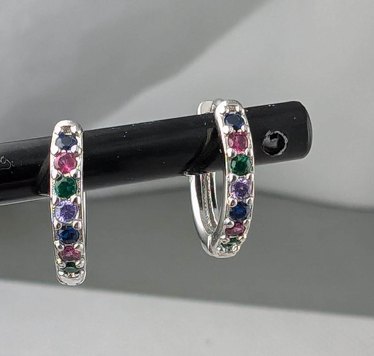 Rainbow Crystal Earrings, Hoop Huggie Dangle Silver Earrings, Cubic Zirconia Crystal Earrings +Bag
