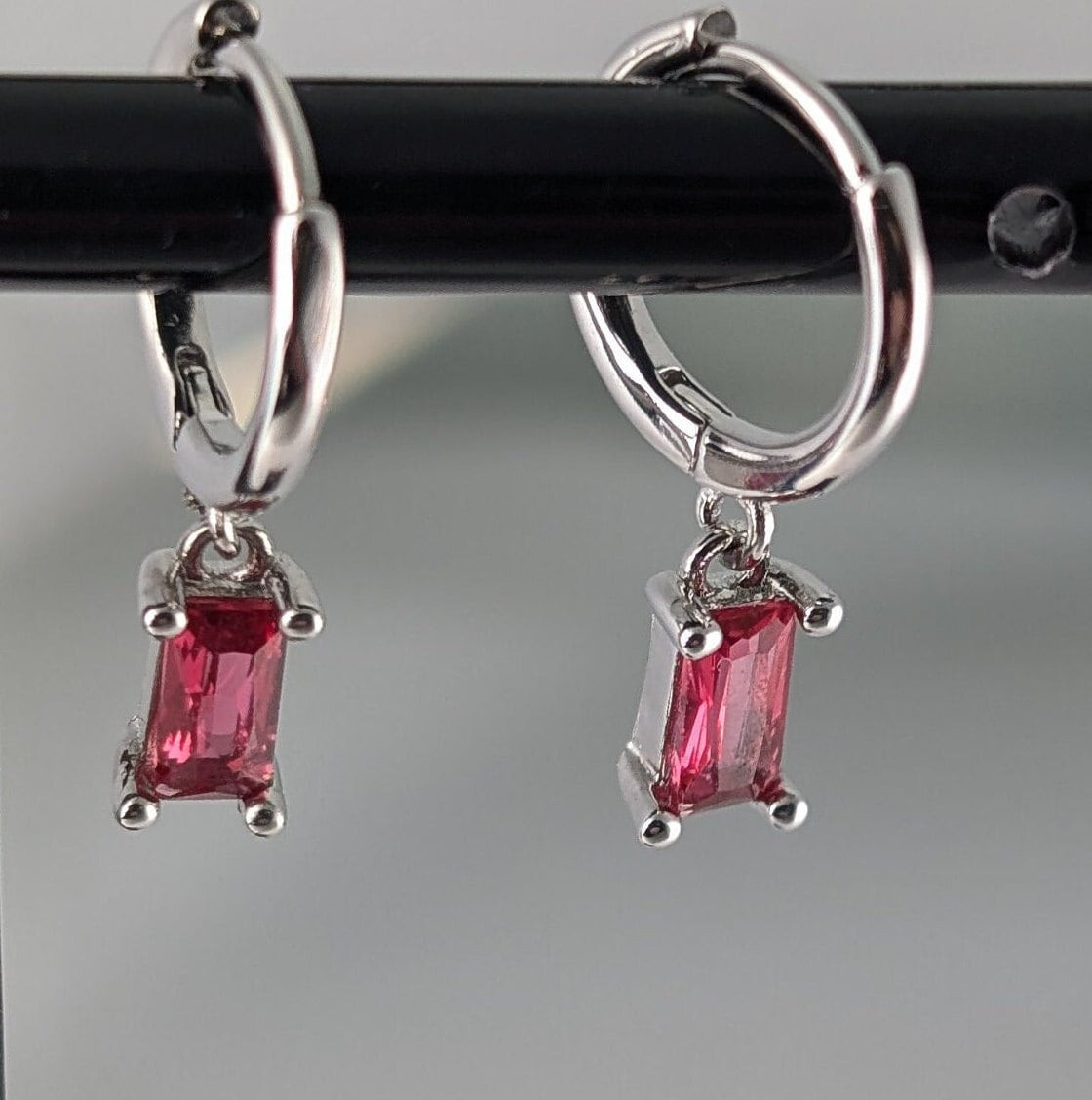 Beautiful Ruby Red Hoop Huggie Dangle Earrings Sterling Silver Plated Cancer July