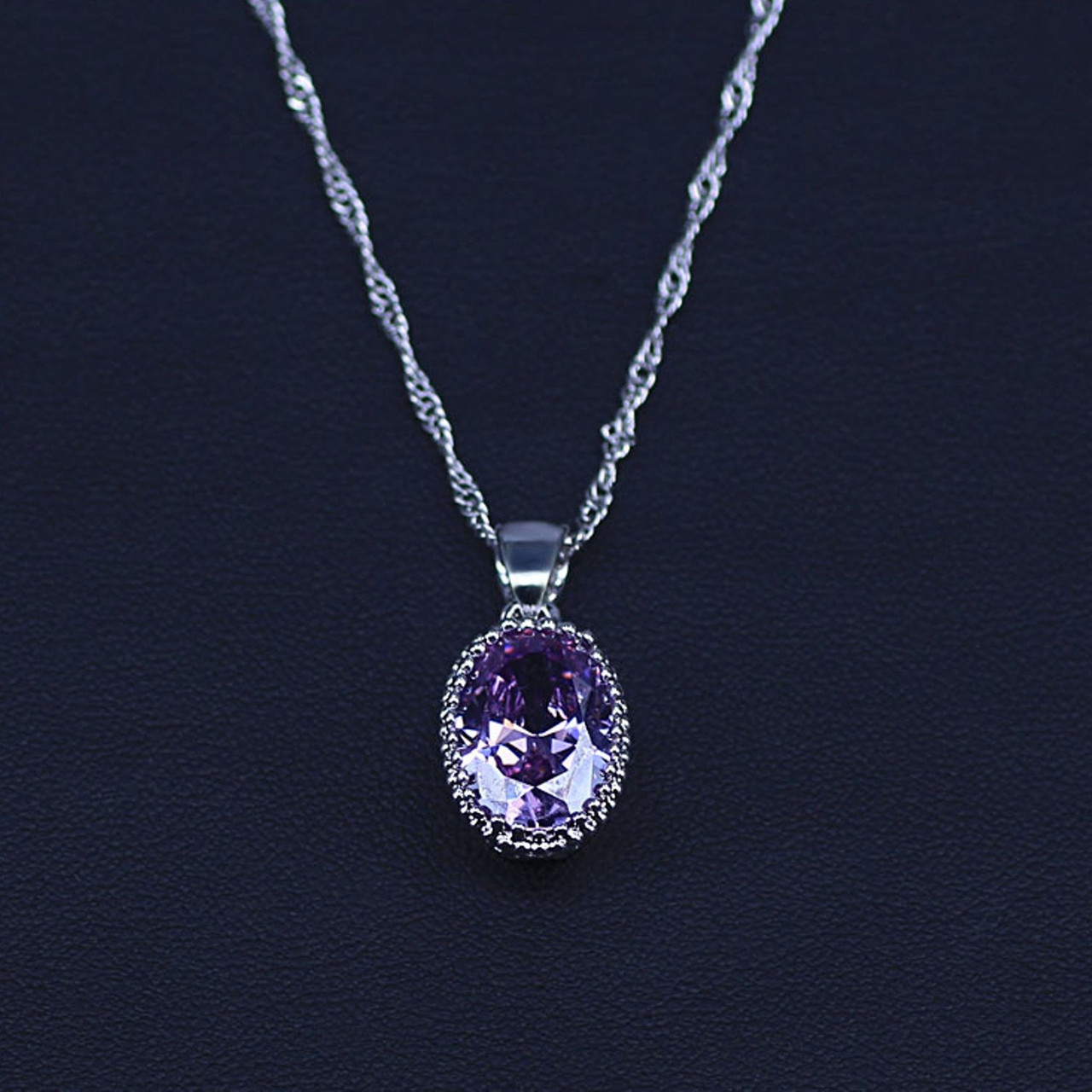 Silver Amethyst/Purple Edwardian CZ Pendant Necklace 45cm + Bag UK Womens/Ladies