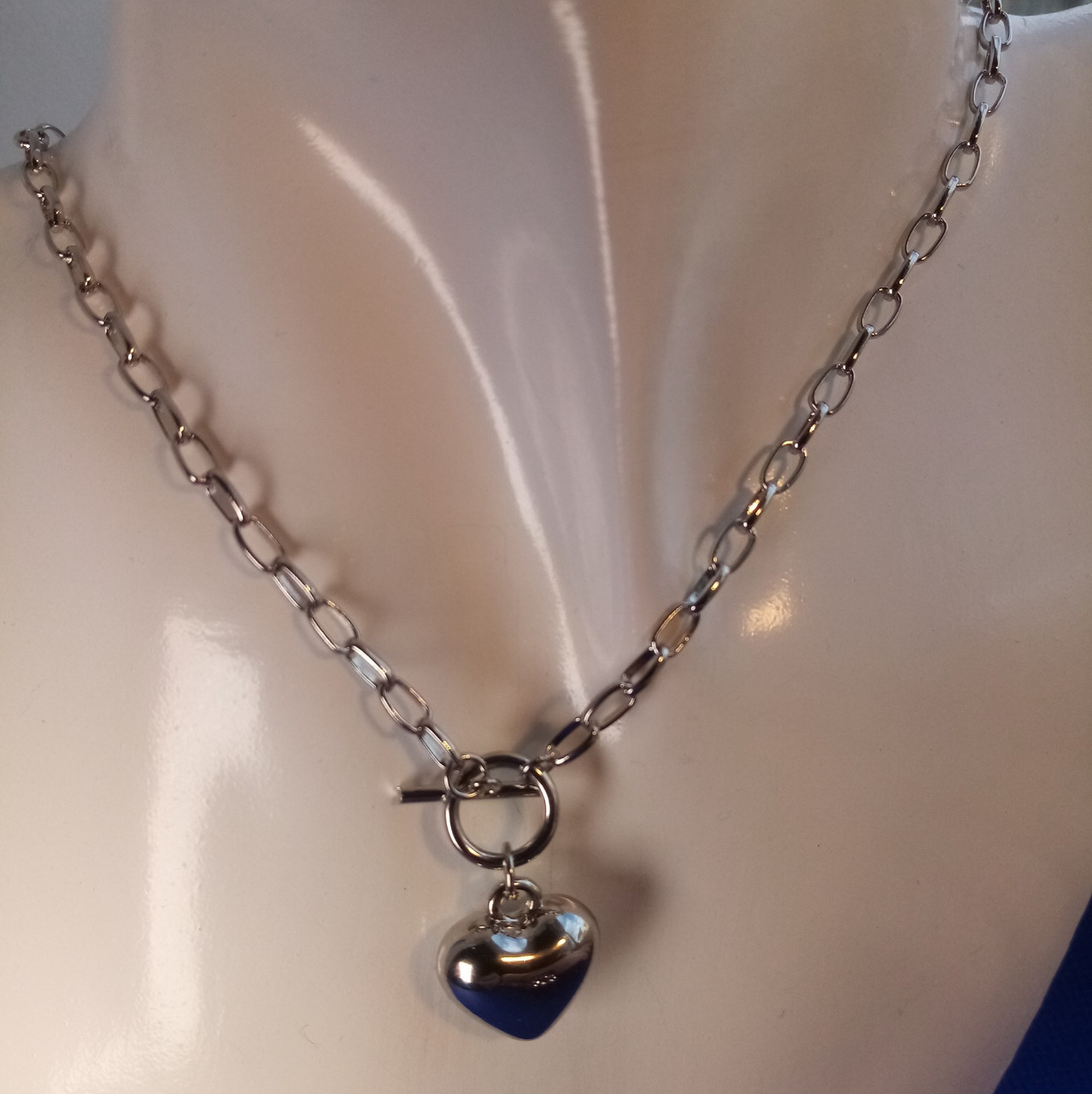 Silver Chunky Love Heart Pendant Necklace Chain 18" Adjustable