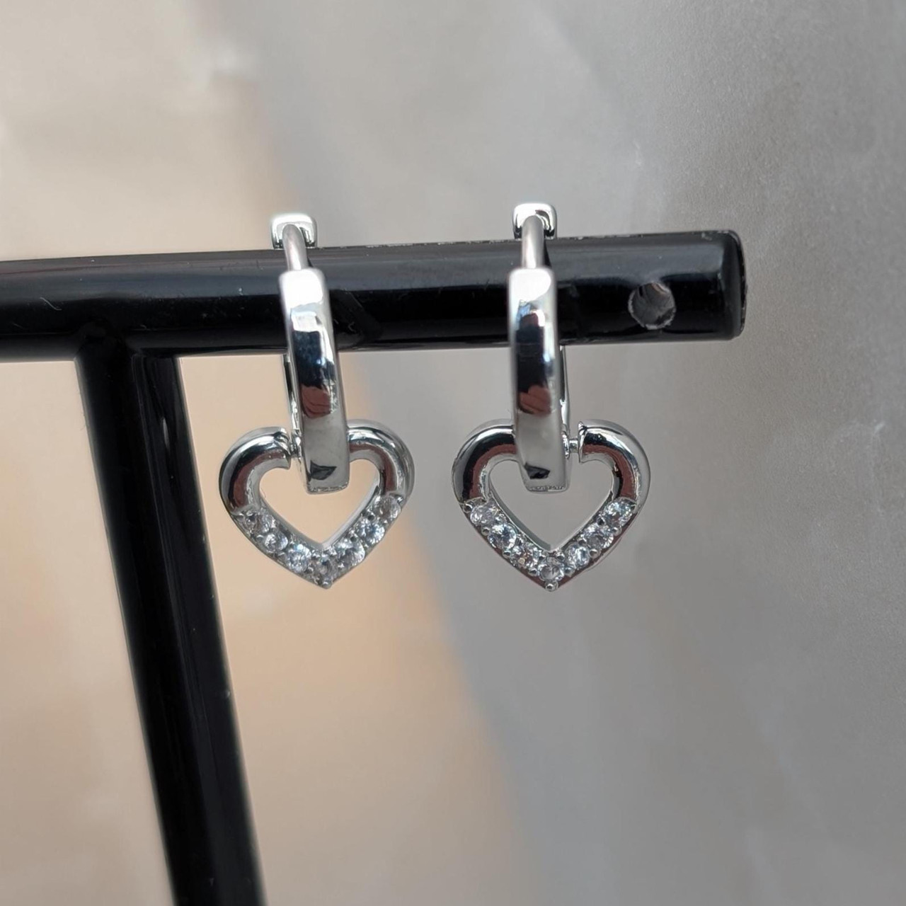 Silver Crystal Heart Earrings, Silver Huggies, Silver Hoops Earrings, Sleeper Earring + Heart 12mm, Sterling Silver Plated