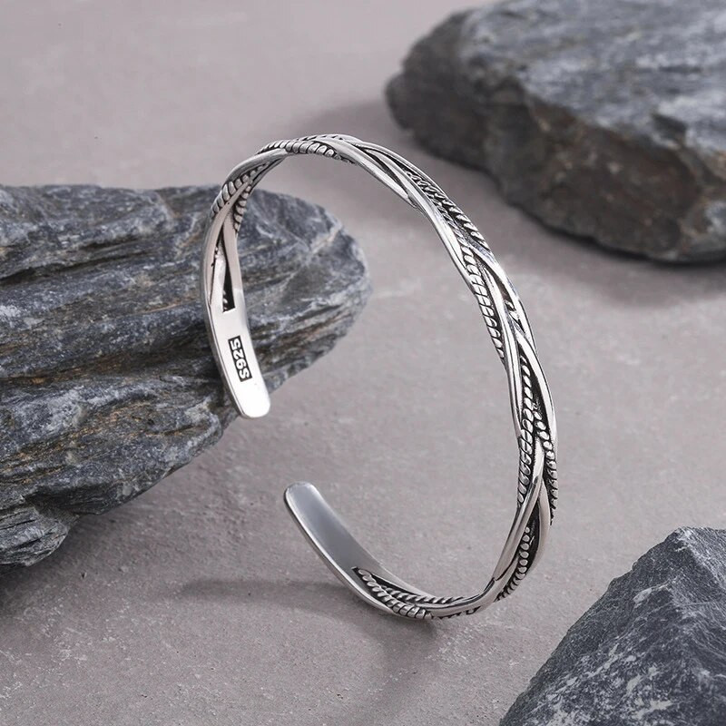 925 Silver Plated Ladies Bangle Solid Twist Woven 4 Strand Adjustable + Bag