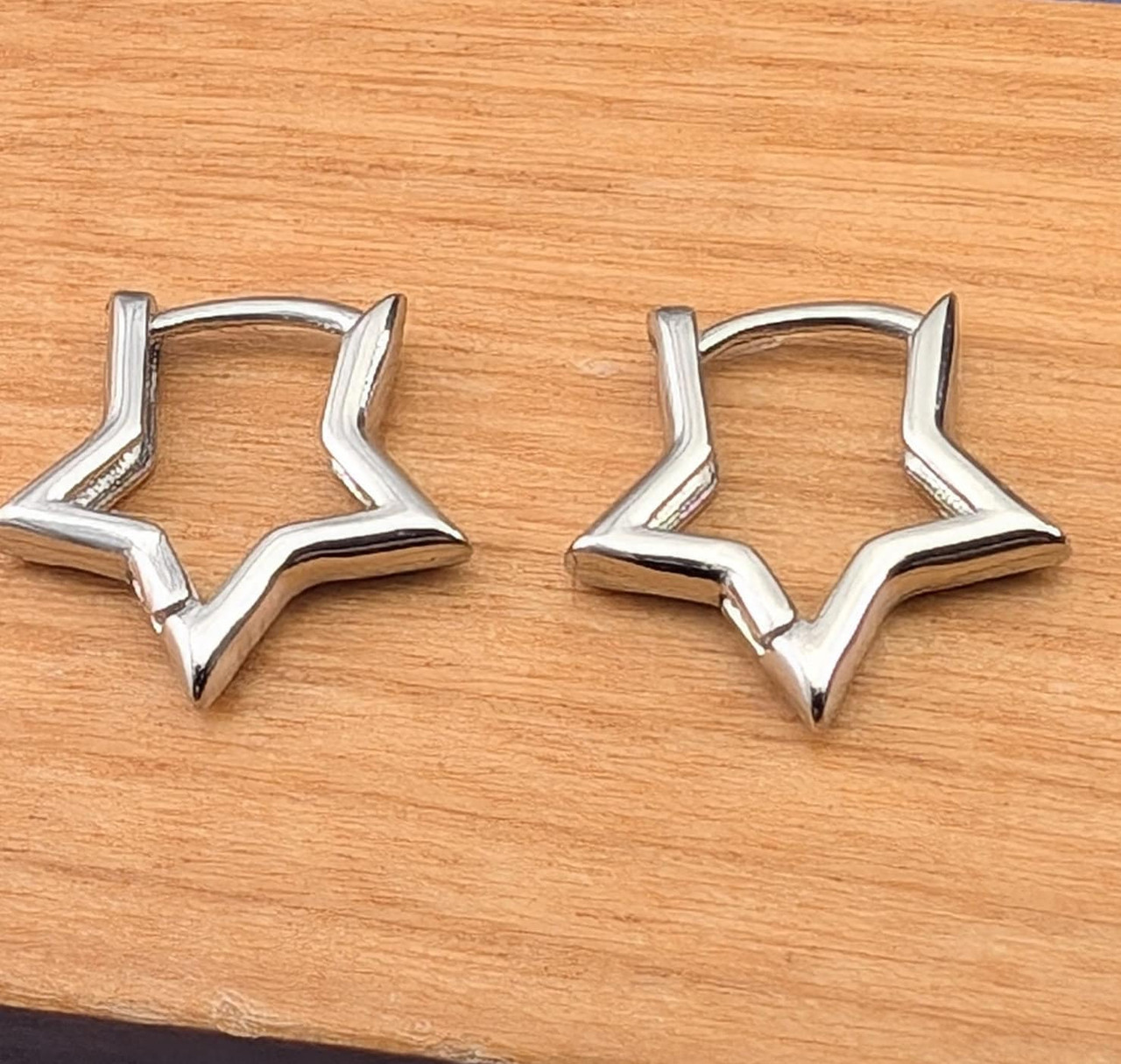 Silver Star Hoop Huggie Sleeper Earrings, Sterling Silver Plated +Bag