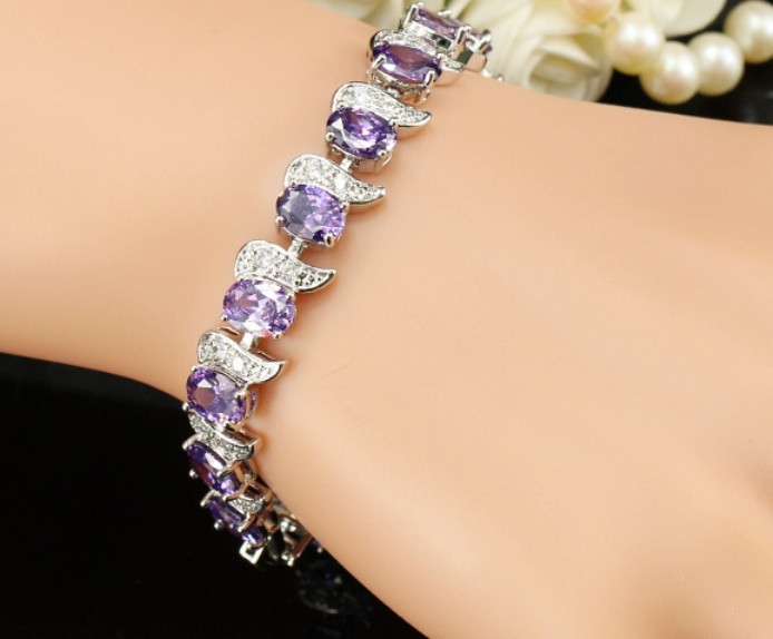 925 Sterling Silver Bracelet Amethyst + White Topaz 17.5cm Adjustable + Gift Bag