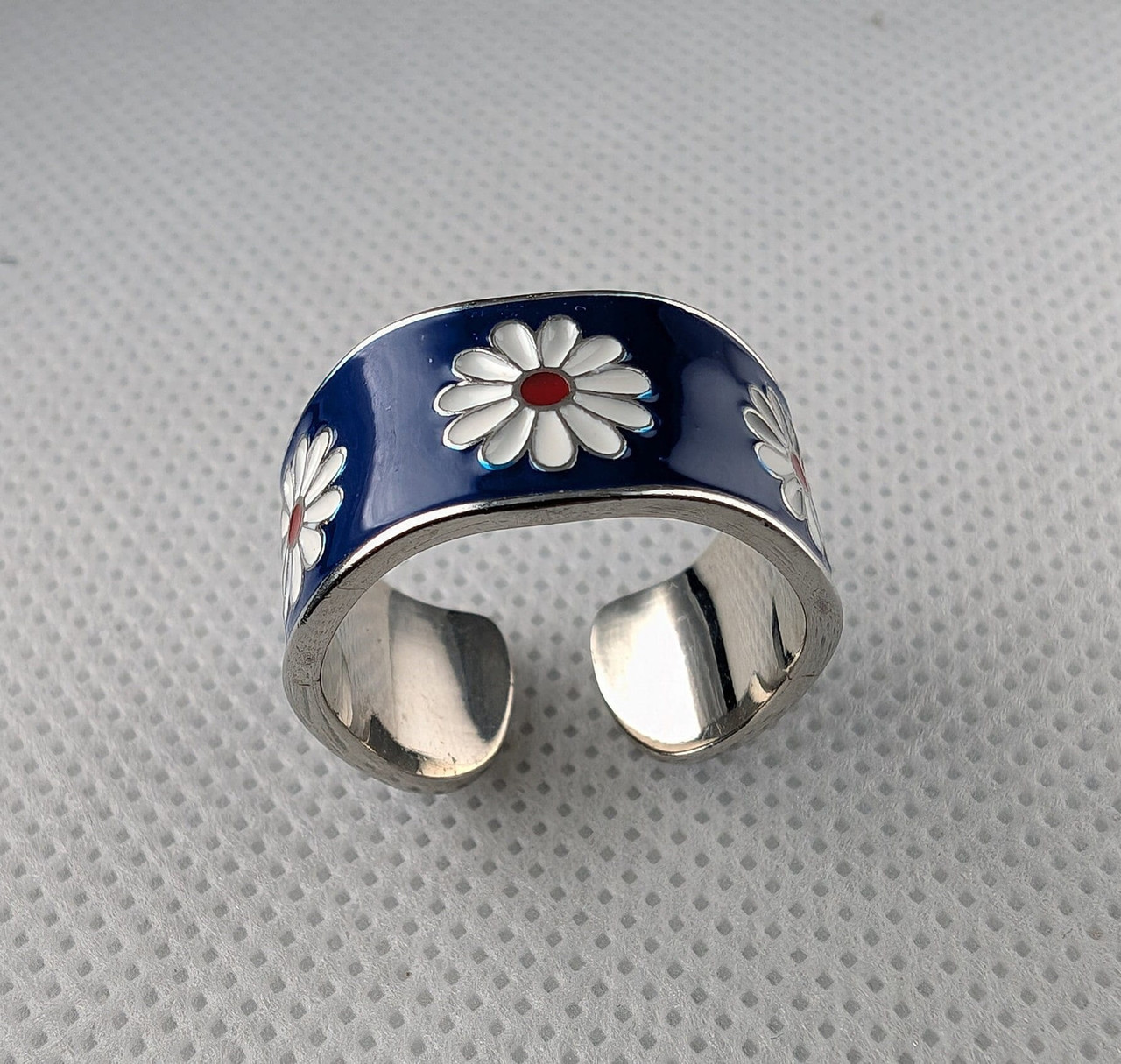 Chunky Daisy Flower Ring, Sterling Silver Plated Ring For Women, Blue Enamel Ring, Adjustable Ring, Resizeable Open Band